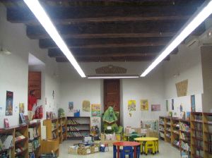 La biblioteca, compuesta de dos plantas que casi rodean un patio interior ahora techado, en tiempos del Medievo fue Cárcel